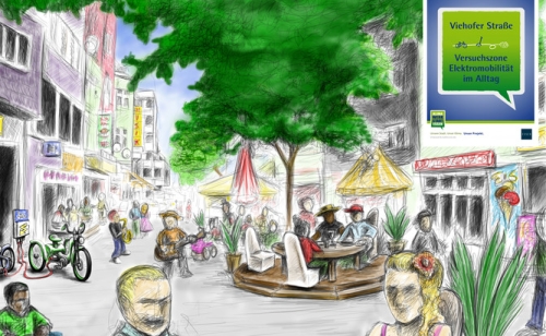 Das Prinzip ist simpel: Die Viehoferstraße soll sich als ein zentraler Treffpunkt im Ruhrgebiet für E-MobilistInnen etablieren und neue InteressentInnen gewinnen. „Wir müssen die Angebote in die Köpfe der Leute hinein bekommen. Dann werden kurze Wege in Zukunft vielleicht nicht mehr mit dem Auto, sondern mit dem E-Bike zurückgelegt. Wir müssen zeigen was möglich ist. Hier sieht man wie man damit anfangen kann“, so Paß. Feststehende Ladestationen, ein Mobility-Café in der Ladengemeinschaft des Unperfekthauses für Stammtische, Vorträge etc. und Leihstationen für diverse Fortbewegungsmittel sorgen für die nötige Infrastruktur. Ziel ist auf lange Sicht auch die Ansiedlung von Fachgeschäften und die Eröffnung einer Selfmade-Werkstatt für E-Bikes, sowie einer Infostation für E-Touren etc.. Auch die bereits ansässigen Gastronomiebetriebe stellen fast ausnahmslos kostenlosen Strom zur Verfügung und zeigen sich offen für die Neuerungen der Straße. Außerordentliche Veranstaltungen wie z.B. die zur Eröffnung organisierte „New-Timer-Rallye “ sorgen zudem für überregionale Aufmerksamkeit für die Versuchszone. Gutes braucht ja bekanntlich seine Zeit und so ist auch dieses Projekt kein temporärer Selbstläufer, sondern eine greifbare Zukunftsvision. Die Essener City-Nord erfindet sich derzeit neu. E-Mobilität hilft ihr bei der Suche. Auch auf lange Sicht.