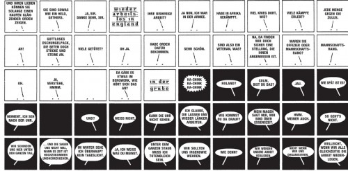 Shane Simmons erzählt in seinem groß angelegten Epos „Das lange ungelernte Leben des Roland Gerthes“ von einem Bergarbeitersohn, der sich in der Unterschicht zwischen Lehrling, Soldat, Grubenarbeiter und Kriegsversehrter durch das Leben schlägt. 1860 geboren, Ende der 1940er Jahre gestorben, erlebt er die Klassenunterschiede mit seinen sozialen Ungerechtigkeiten, den Krieg mit seinen Grausamkeiten, die Religion mit seinen Absurditäten und das Familienleben mit allen Aufs und Abs. Als grafischen Gesellschaftsroman konnte Simmons das nur umsetzen, indem er die sprechenden Figuren nur als Punkt vor weißer Fläche gezeichnet hat, die bissig-ironischen Dialoge darüber. Das funktioniert bei aller Abstraktion ausgesprochen gut. Es ist zu hoffen, dass der avant-verlag auch die beiden anderen sogenannten „Longshots“ von Simmons mit Biografien eines Enkels und eines Großvaters von Roland Gerthes veröffentlicht.