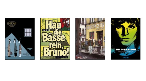 Jeff Lemires erzählt in groben Tuschezeichnungen vom Leben in Ontario. Der erste Band „Geschichten vom Land“ seiner Trilogie „Essex County“ begleitet einen Waisenjungen, der bei seinem Onkel lebt und in Superheldenfantasien flüchtet. Bis er in dem ehemaligen Eishockeyspieler Jimmy einen Freund findet. Der zweite Band „Geister Geschichten“ geht zurück in die fünfziger Jahre und begleitet zwei Brüder bei ihrem kurzen Erfolg als Eishockeyspieler. Beide Bände sind vage miteinander verbunden. Lemire beherrscht die Kunst, mit wenigen Strichen einfühlsam und behutsam das tragische Leben seiner Figuren zu skizzieren (Edition 52). In „Markttag“ erzählt James Sturm von einem osteuropäischen Teppichknüpfer, der eines Tages erkennen muss, dass ihn die Industrialisierung übergeht. An einem beschwerlichen Markttag nimmt das Unglück seinen Lauf. Sturm, der bereits mehrmals historische Szenarien entwickelt hat, lässt hier in erdigen Ligne Clair-Zeichnungen eindrucksvoll das Handwerkswesen des frühen 20. Jahrhunderts und dessen aussichtslosen Kampf gegen den aufkommenden Kapitalismus auferstehen (Reprodukt). Frédéric Bertocchini und Jef widmen sich mit „Jim Morrison – Poet des Chaos“ in schweren, düsteren Zeichnungen dem Leben des charismatischen Sängers der Doors. Um Entmystifizierung scheren sie sich nicht, vielmehr gehen sie genau diesen Pfad: Morrison, der todgeweihte, von Genie und Wahnsinn gerittene Einzelgänger, lautet das wenig überraschende Ergebnis ihres skizzenhaften Biopics (Splitter).